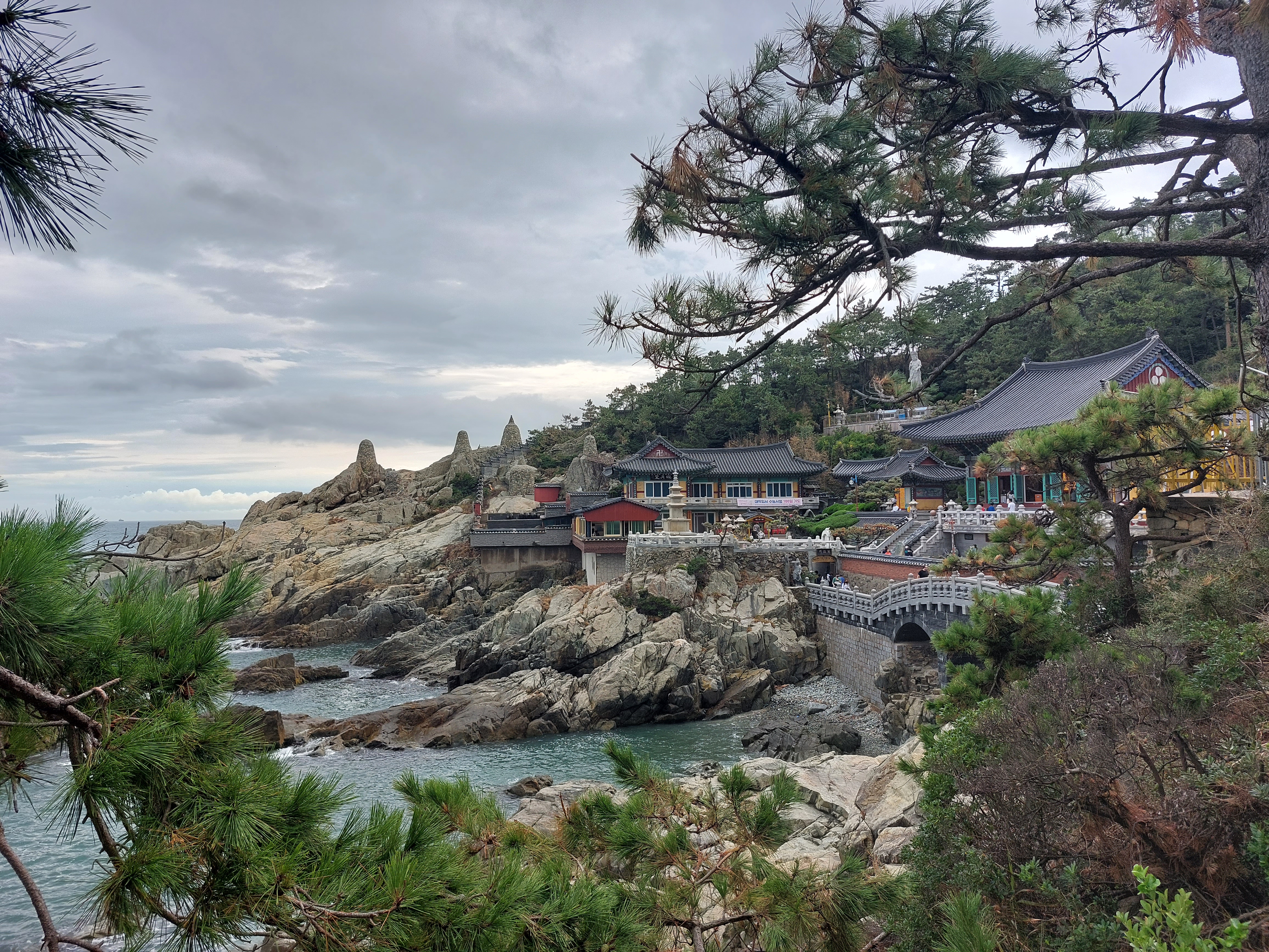 비가 내린 뒤라 길이 아주 미끄러웠다. 계단에서 미끄러져 넘어질 뻔했다. 넘어졌다면 걸어서 돌아가지는 못했을 거다. 세차게 치는 파도가 복잡한 마음을 풀어주는 듯했다. 얼룩진 나를 씻겨준다. 그런 감동을 받으며 경치를 구경하고 다리를 건너 사찰에 들어섰는데 이곳도 온갖 장사로 복잡했다. 소원을 빌기 위해서는 돈을 써야 한다. 우리나라에서 가장 아름다운 사찰이라는 이름을 걸고 하는 사업행위가 그 아름다움을 헤친다는 생각이 들었다. 그래도 사찰에서 바라보는 바다는 경치는 좋았다.