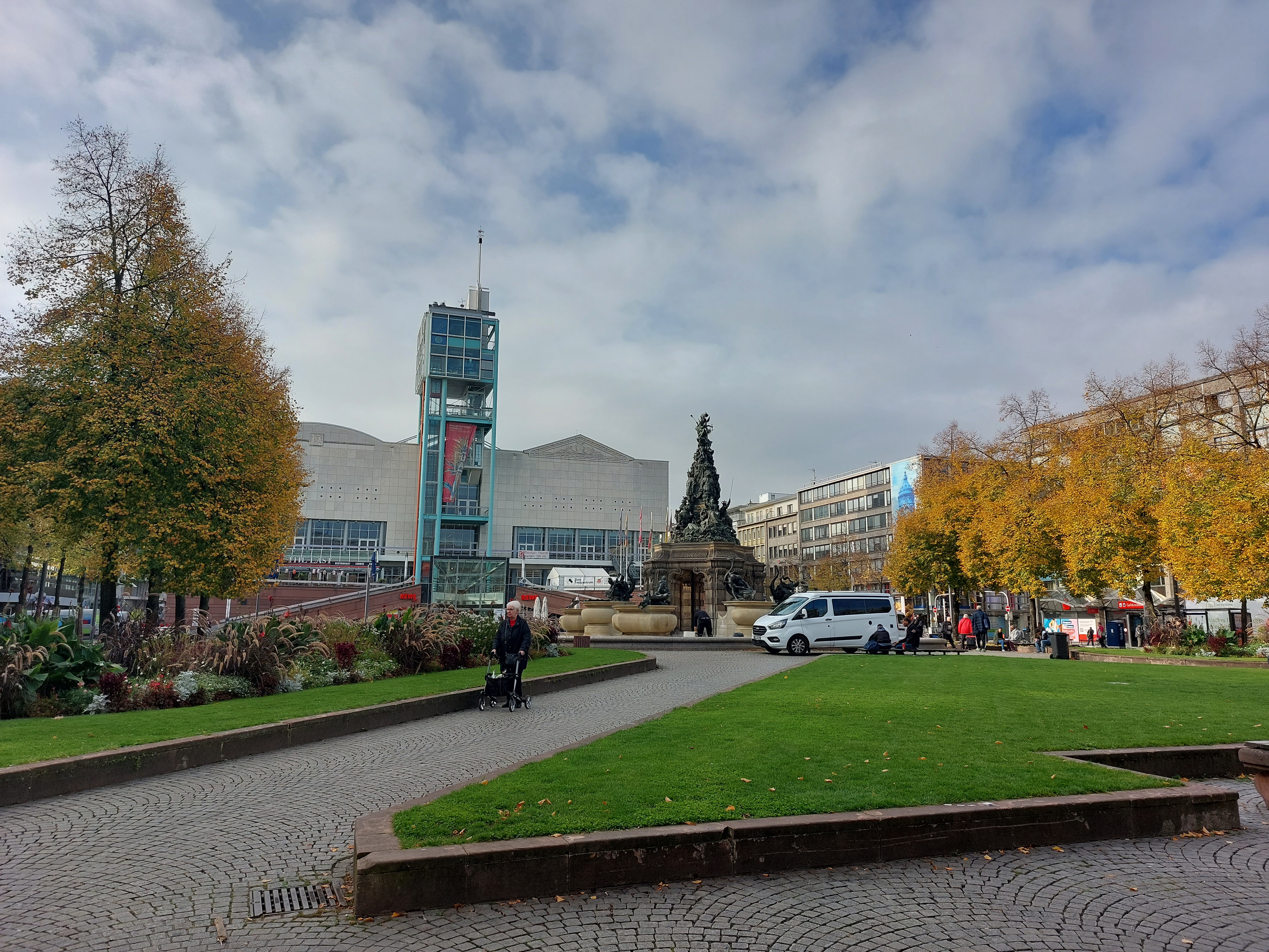 만하임의 중심에 있는 광장이다. Paradeplatz는 퍼레이드광장 또는 군대 사열식장이라는 의미이다. 광장 중앙에 있는 조각상은 때를 벗기고 불광을 내고 있었다. 뒤편으로 레베(REWE) 상점이 있다. 레베는 다른 마트에 비해서 가격이 높은 편이다.